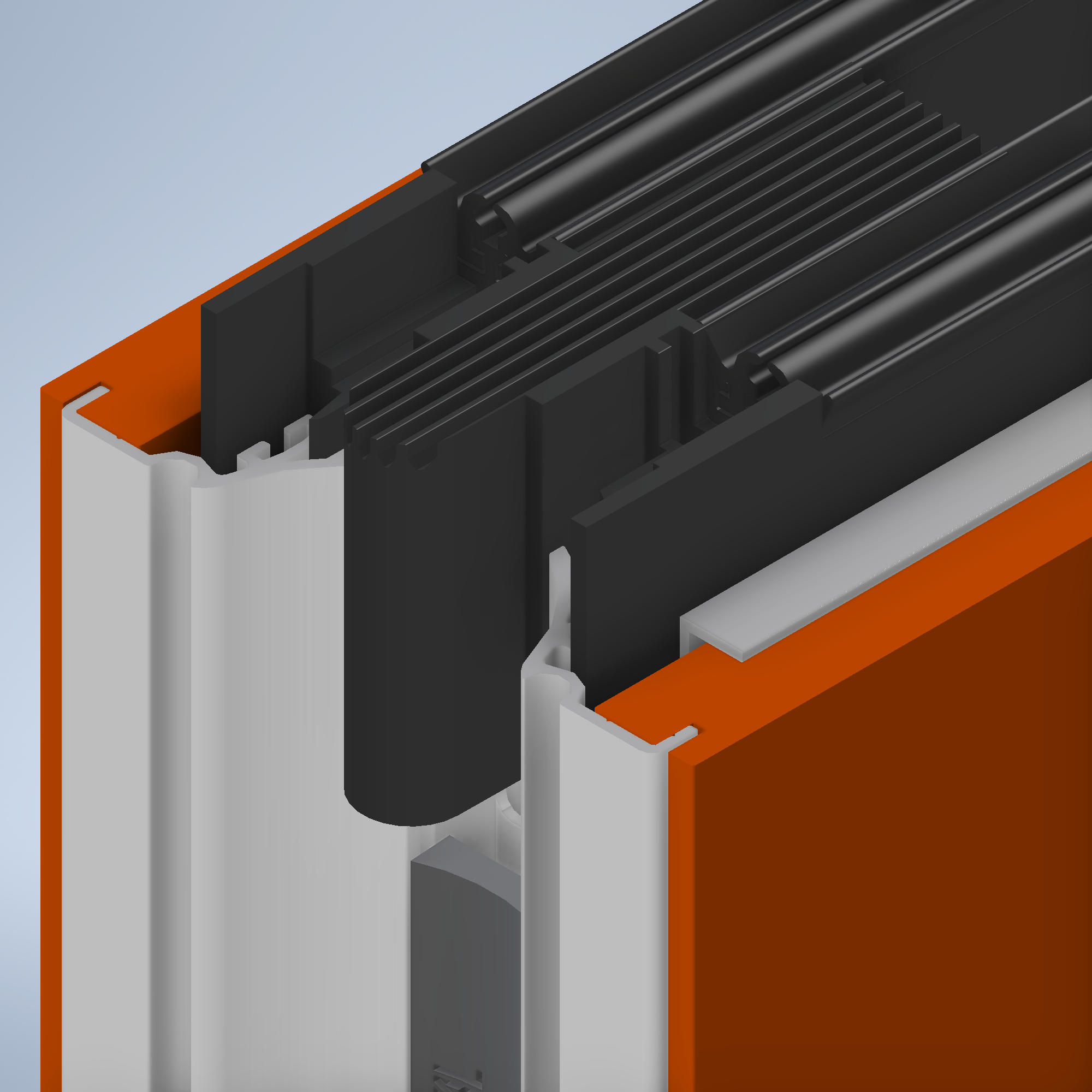 Horizontale afdichting: De speciaal ontwikkelde form delen M/V in de drukbalken zorgen voor een perfecte koppeling van de drukbalken. In combinatie met de verticale aluminium koker profielen zorgen ze voor een optimale geluidsisolatie.