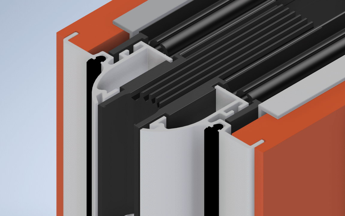Het frame heeft aan de binnenzijden rondom rubbere profielen waarin de buitenplaat geheel vrijdragend wordt ingeperst. Hierdoor is er geen direct contact tussen frame en buitenplaten en waarborgt een optimale geluidsisolatie.